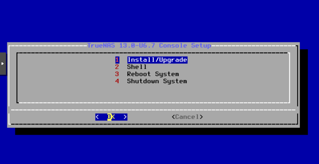 - TrueNAS 설치 메뉴가 표시되면 1번(Install/Upgrade)을 선택하고 Enter를 누릅니다.